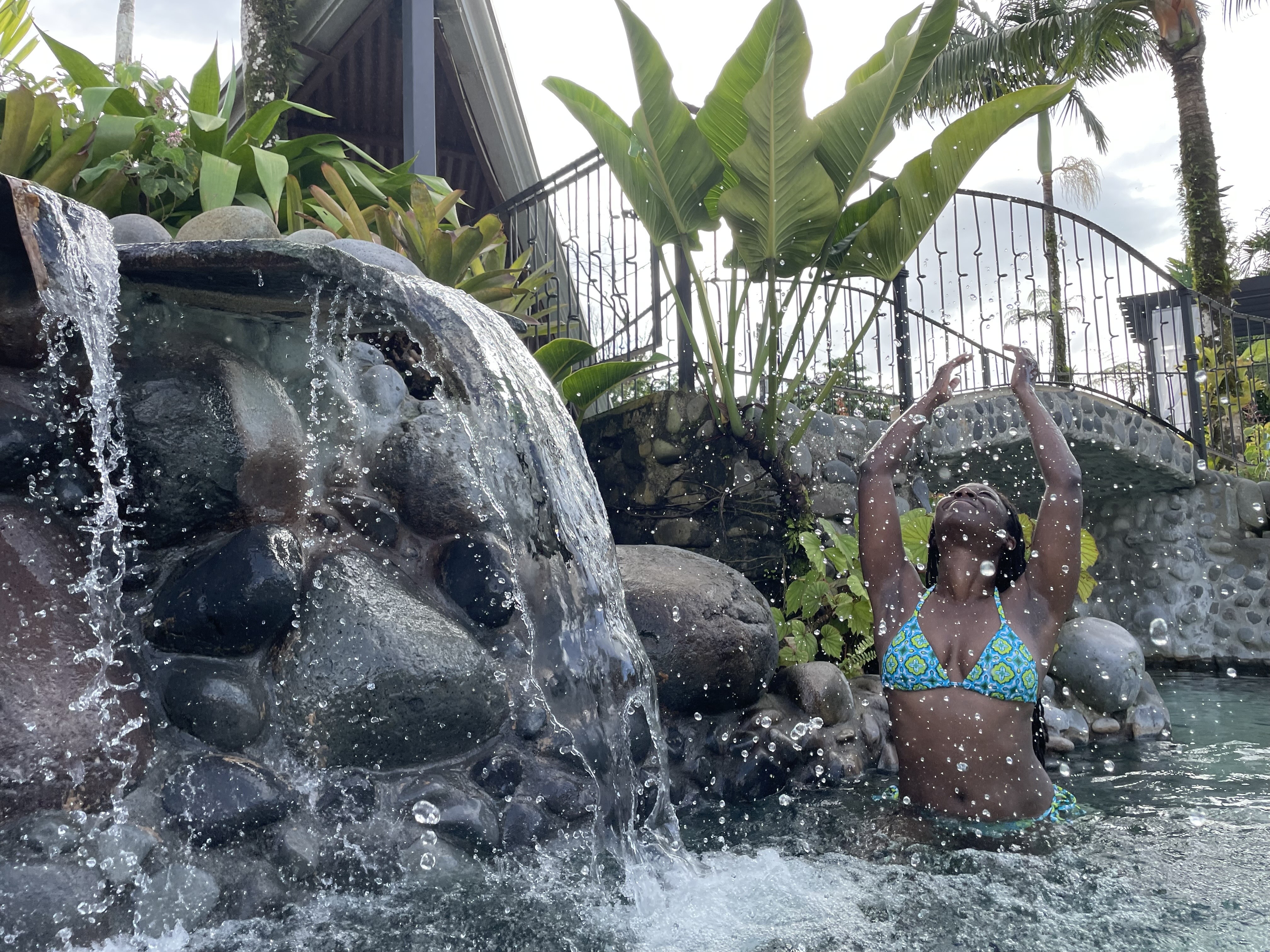 Image Description: Dr. Afia Ofori-Mensa is enjoying a swim under a small waterfall at our host Hotel in La Fortuna, Costa Rica. Dr. Ofori-Mensa is Black women with dark skin tone with long locs. Both of her arms are extended above her head is faced towards the sky, eyes closed, and a closed mouth smile on her face.